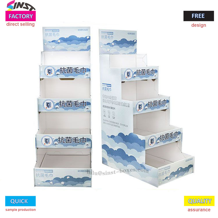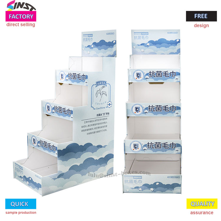 Bu qalın karton dəsmal dəsti, supermarketlər, bakkallar və gözəllik dükanları kimi sürətli hərəkət edən istehlakçı ssenarilərinin ehtiyaclarına mükəmməl cavab verir. Dəsmal ekranı rafının pilləli quruluşu, toxumalar, portativ əşyalar, üz dəsmalları, nəm salfetlər və s. Kimi müxtəlif xüsusiyyətlərin dəsmallarını səliqəli yerləşdirə bilən "laylı bir saxlama qutusu" kimidir. Üstündəki tanıtım kartı, "ana və körpə səviyyəsi sertifikatı" kimi xüsusiyyətləri ilə birləşdirilə bilər və dəsmallardakı dəsmallar "özləri üçün danışmağa" imkan vermək üçün "yumşaq və tökülməmiş".