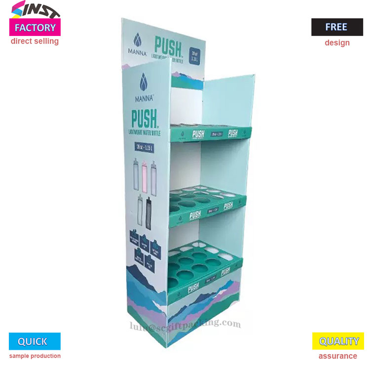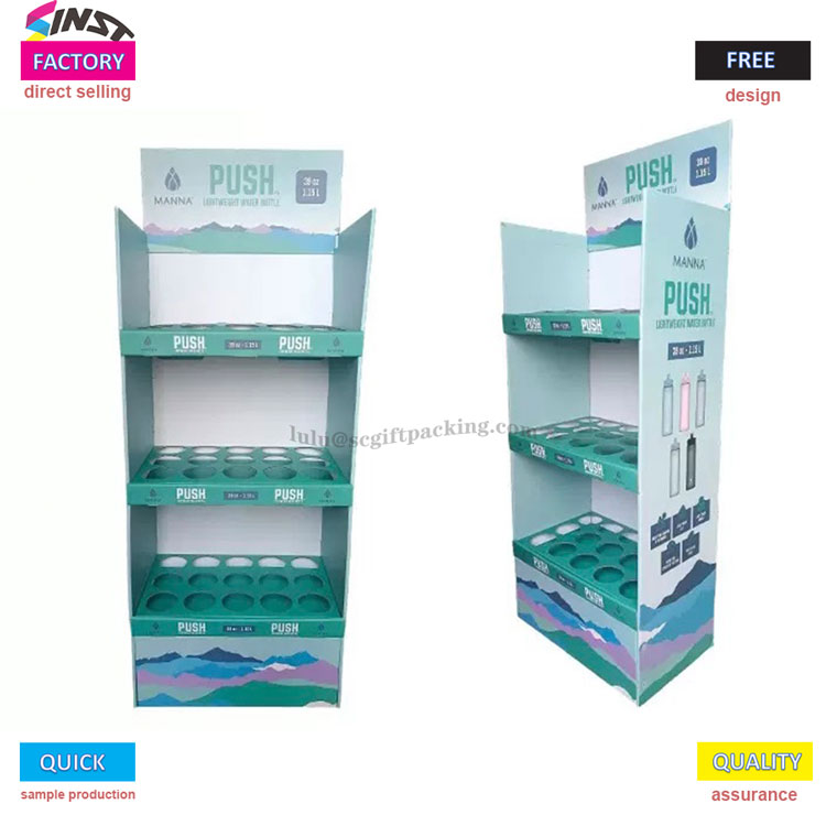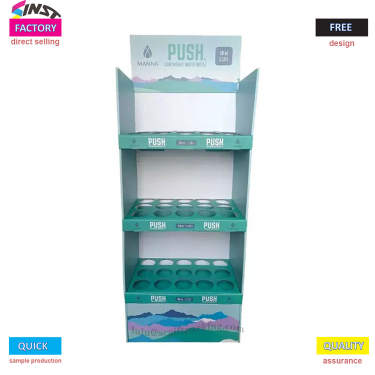 Supermarke su şüşəsi üçün bu karton karton mərtəbə ekranı, su şüşəsini dəqiq tutmaq və yuvarlanmanın qarşısını almaq üçün hər qatda dairəvi yivlər olan üç qatlı bir grid quruluşu dizaynı var. Marka loqotipi yuxarıda çap edilə bilər və məhsul qrafikləri yan, sadə və yüksək səviyyədə çap edilə bilər. Əsasən su şüşələri, stəkan, süd çay stəkanları, termos stəkanları və s. Kimi məhsulları göstərmək üçün istifadə olunur.