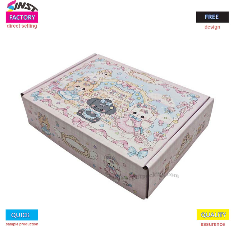 Paltar üçün rəngarəng büzməli kağız təyyarə qutusu açıq mavi vurğu olan şirin çəhrayı rəng sxemidir. Qutu, çiçək çələngləri, kiçik heyvanlar, yaylar, buludlar və ürəklər, xəyalpərəst və sevimli bir üslub yaratmaq kimi cizgi filmi elementləri ilə doludur. Görünüşdən xidmətə qədər, geyim qablaşdırmalarını tamamilə gücləndirir və marka müraciətini artırır.