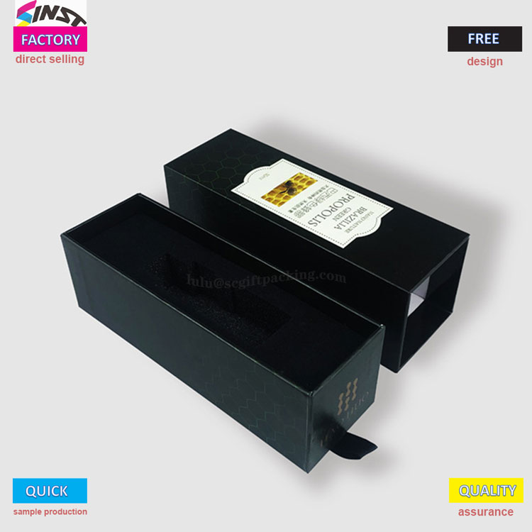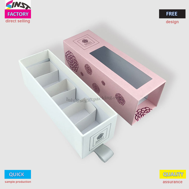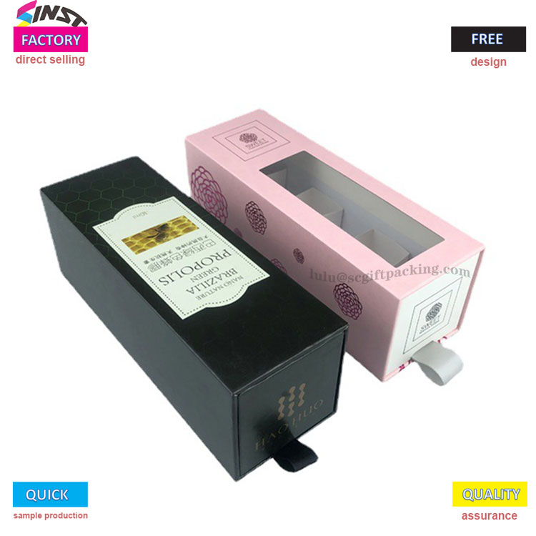 Efir yağı üçün lüks sərt çekmece sürüşmə hədiyyə qutusu qablaşdırma, sadə və lüks bir hiss yaratmaq üçün çəhrayı və qara rənglərin toqquşması olan iki rəngli hədiyyə qutusu kimi hazırlanmışdır - çəhrayı qutu dərin bənövşəyi çiçəklər / bənövşəyi naxışlar ilə bəzədilmiş və məzmunun birbaşa görünüşü üçün şəffaf bir pəncərə ilə gəlir; Daxili astar, ağ bir bölücü və bir çəkmə nişanı dizaynına malikdir, sadəcə incə bir çəkmə ilə asanlıqla çıxarılmasına imkan verir. Zərgərlik, gözəllik nümunələri və ya 30ml propolis şüşəsi, təmiz və narahat bir pulsuz mühitin təmin edilməsi üçün beş ayrı bölmə mövcuddur. Dırnaq lakı yapışan hədiyyə qutusu, dodaq boyası hədiyyə qutusu, nümunə hədiyyə qutusu və s kimi istifadə edilə bilər;
